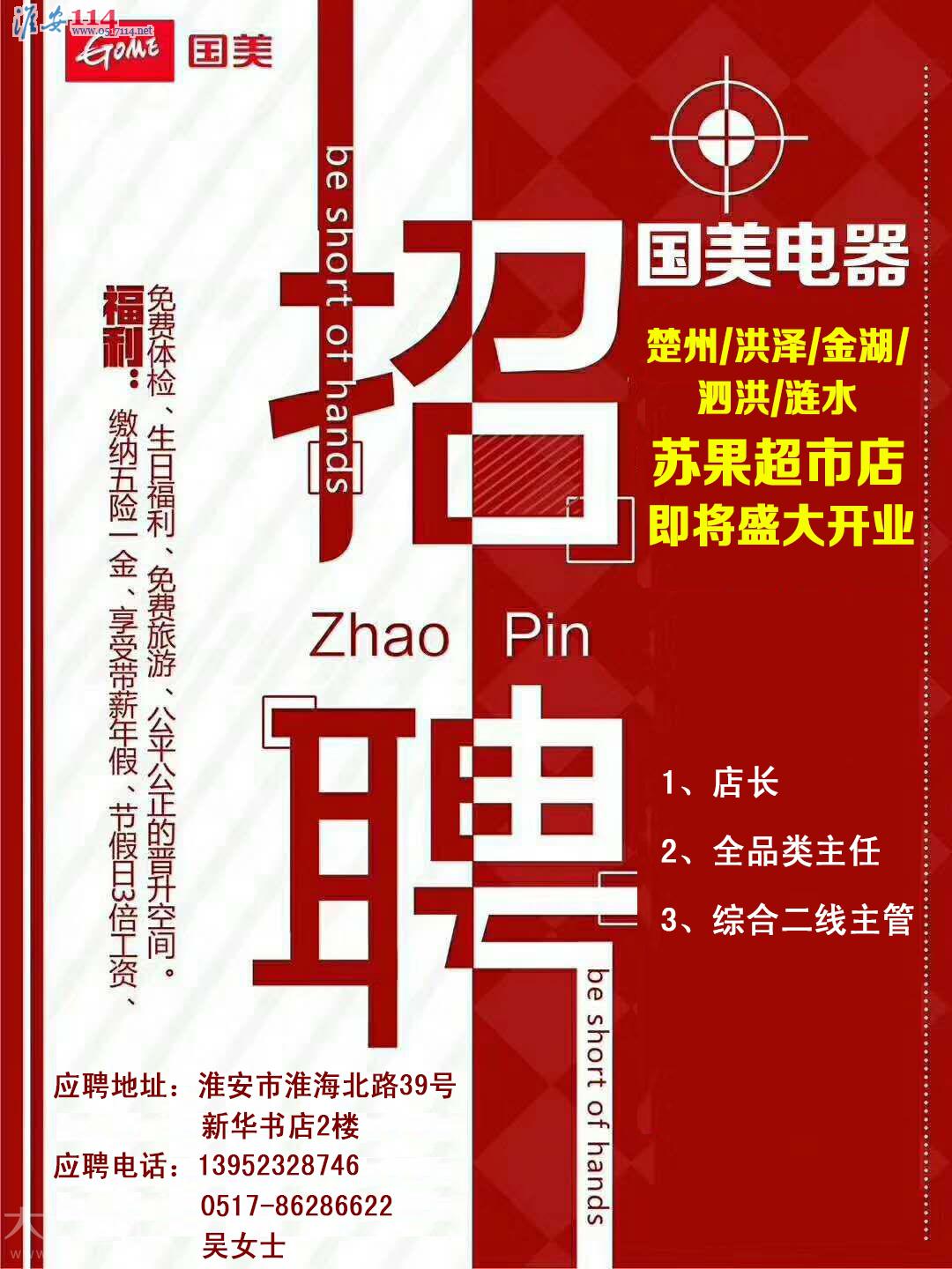 淮安百姓網(wǎng)關(guān)鍵詞:國美電器洪澤蘇果超市,洪澤店長招聘,洪澤主管招聘