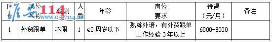 招聘外貿(mào)跟單員1名,性別不限,年齡40周歲以下,熟練外語,有外貿(mào)跟單工作經(jīng)驗3年以上,月薪6K以上。
