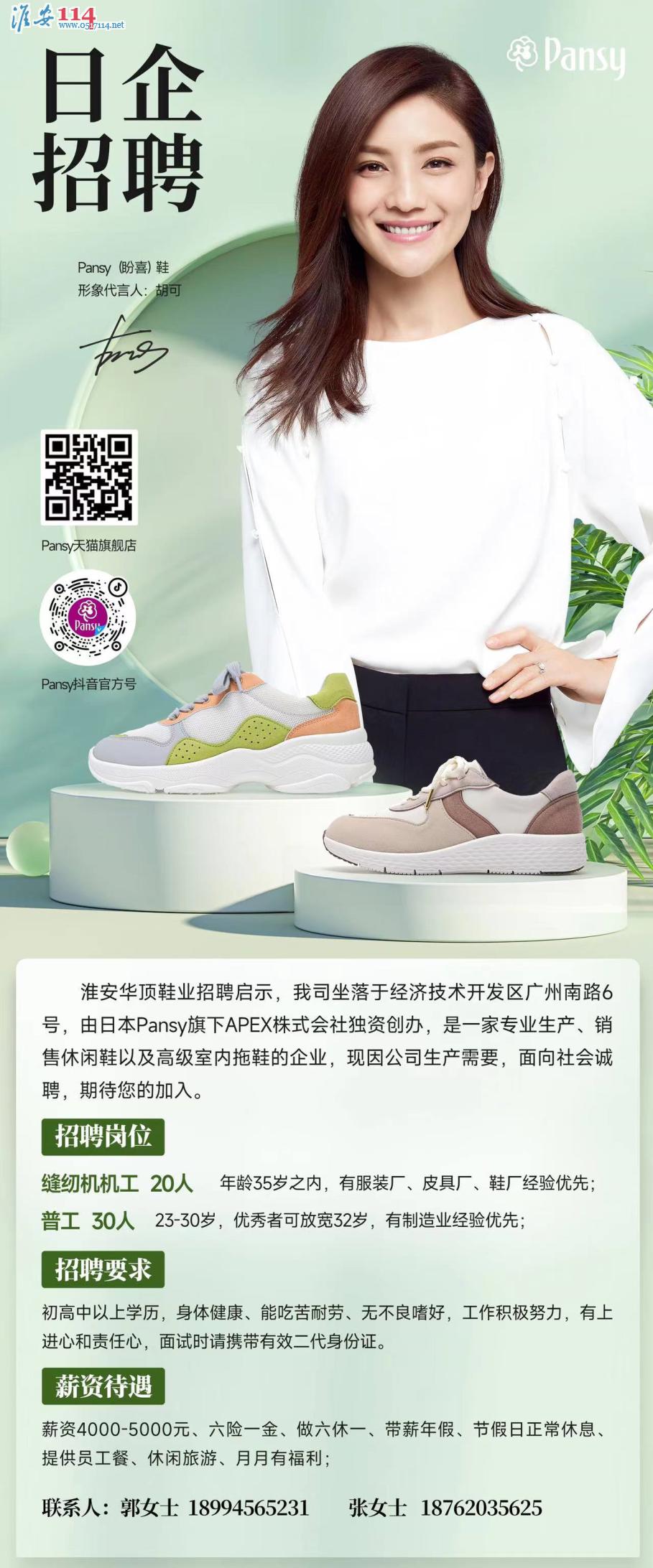 淮安百姓網(wǎng)關鍵詞:淮安華頂鞋業(yè)招聘縫紉機工若干名,有制造業(yè)經(jīng)驗優(yōu)先!